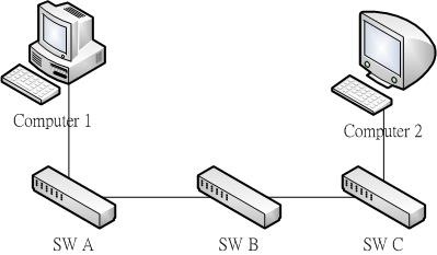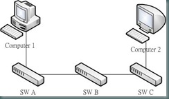 如上圖例, 電腦2原本在SW B, 有設定port security, 後來移到SW C也設了port security, 但是忘了把SW B的設定拿掉! 就會出現"電腦2和SW C上的電腦可以互連, 但是無法連到SW A上的電腦"的情況! 原因就是封包由SW C到SW A後, 再回到SW B時, 就被轉送到不正確的埠了!